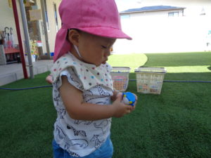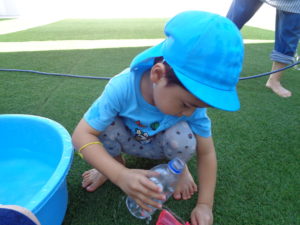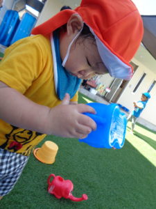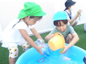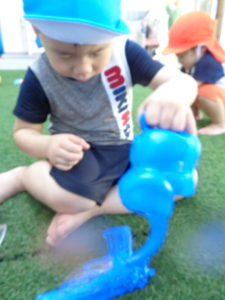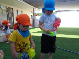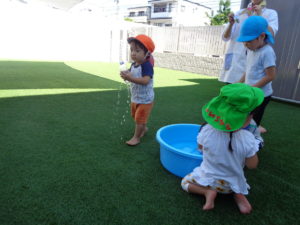 水鉄砲をしたり、バケツに水を入れたりと、それぞれに好きな遊びを見つけて楽しんでいましたよ♪