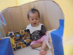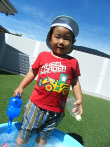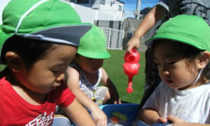 好きなおもちゃを手に取りお友だちと一緒にタライに入って