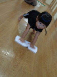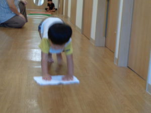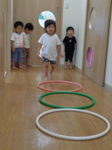 わっかをジャンプしたり、廊下を雑巾がけしたり・・・