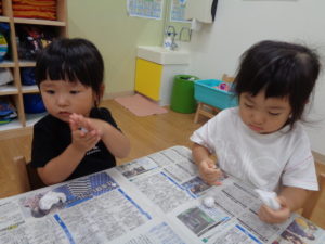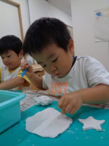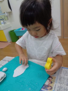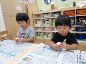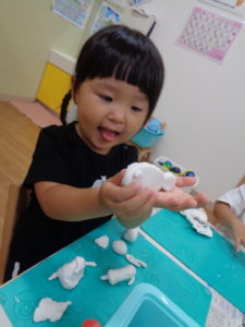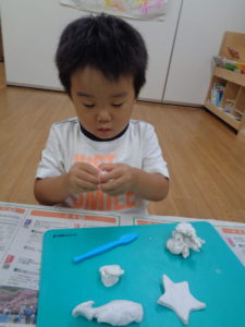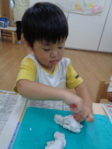体をいっぱい動かした後は、粘土でいろんな形を作って遊びました(^^♪