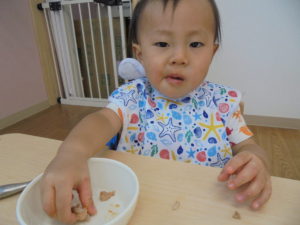 給食もたくさん食べましたよ😚離乳食から幼児食に移行中です!スプーンを持ったり、自分で手づかみしたり意欲的に食事ができています(^^)/