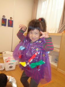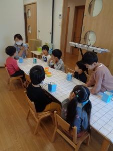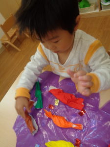 前日に作ったキャンディーを「あかにする~!」「つぎはピンク~!」と色を言いながら貼って行きました♪