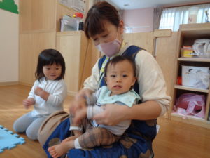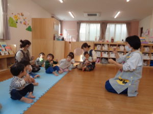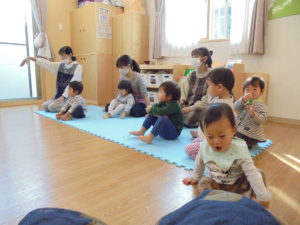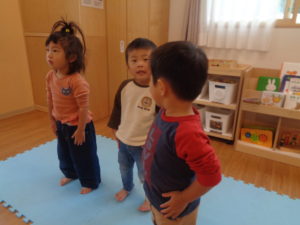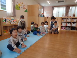いちご組、ひまわり組さんは まずは「♪げんこつ山のたぬきさん」