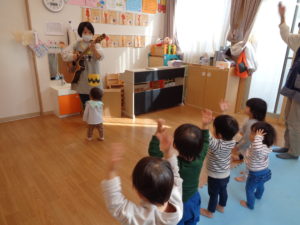 「♪幸せなら手をたたこう」です!ギターの音をよく聴いて