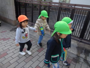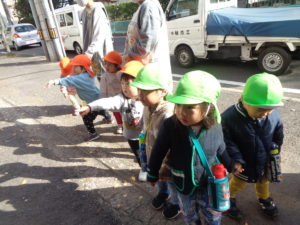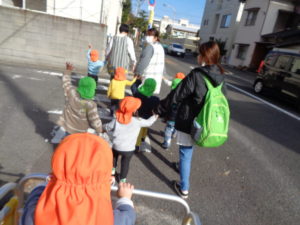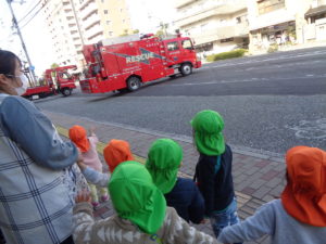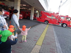 消防署の前を通ると、ちょうど消防車が出発しようとしており、みんなで「いってらっしゃい」と手を振ると、振り返してくれて子どもたちも大喜びでした(^^)