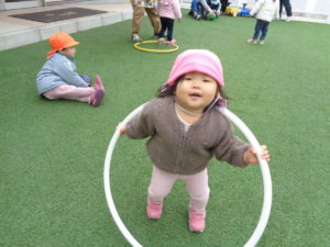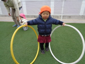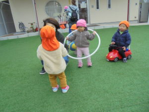 フラフープやボール、車のおもちゃを使って沢山体を動かしたら、寒さなんて忘れちゃったね❤