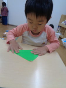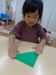 折り紙でツリーを折ったり、雪に見立ててペタペタ貼ったりしました🎄