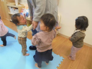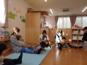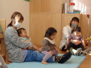 先生の足の上に座ってスタンバイ✨さるのこしかけのわらべ歌でスタートです°˖✧◝(⁰▿⁰)◜✧˖°