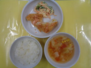 いい香りにつられて給食室をのぞくと、給食の先生が一生懸命揚げてくれていました!!