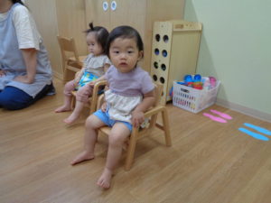 めろんぐみさんとそらぐみさんは、椅子に座って上手に待っています♬