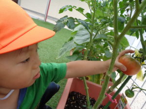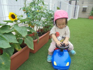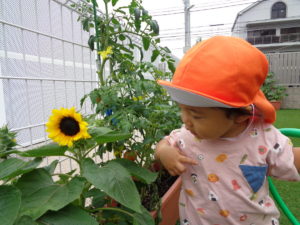 お部屋でなぐり描きを楽しんだ後は、「お外にいきたい❕」と帽子と靴下を保育者のもとへ持って行き猛アピール✨みんなのお願いどおり久しぶりに園庭へ。ひまわりが咲いているのを教えてくれたり、大好きなトマト🍅を発見しながら戸外遊びを楽しみました(●´ω`●)
