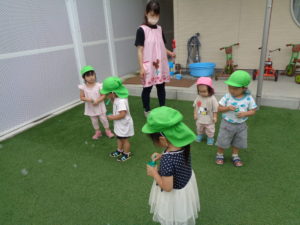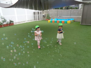 園庭でしゃぼん玉を楽しみました。自分たちでたくさん、しゃぼん玉を作れるようになっていました°˖✧◝(⁰▿⁰)◜✧˖° 女の子はみんなで協力して大きいしゃぼん玉を作ろうとしているのかな🎵