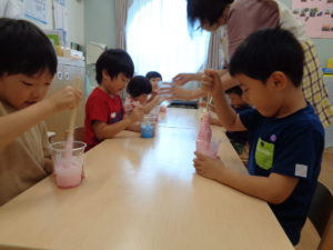 そら組のお友だちは…コップの中に洗濯のりと〇〇と秘密の粉を入れてまーぜまぜ(^^♪