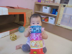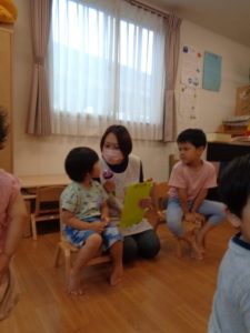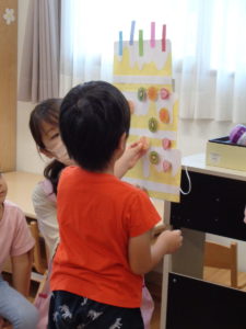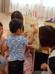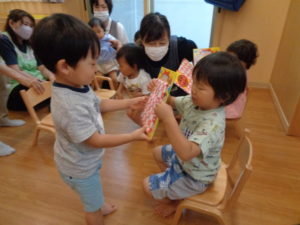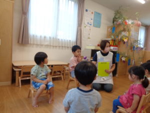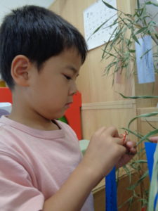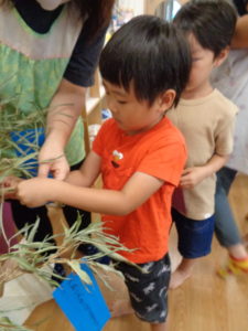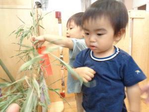 誕生会の後は、七夕です。お話はちょっと難しいけど、笹には興味津々👀