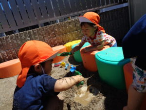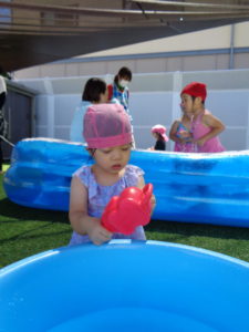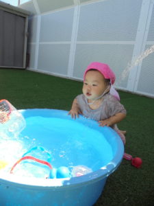 いちご組さんは、水遊びをしました。シャワーやお水をすくったりおもちゃを浮かべて、水の感触を楽しみました。