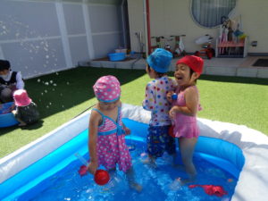 めろん組さんは、ダイナミックにプール遊びをしました。