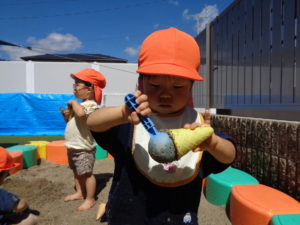 ひまわり組さんは、泥遊びをしました。泥の冷たくてドロッとした感触を体全身で楽しみました。