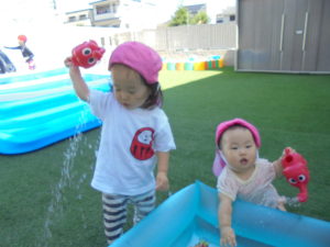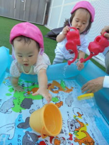 製作の後は水遊び(*’▽’)。ジョウロやバケツから出てくるお水、気持ち良かったね🌈