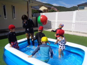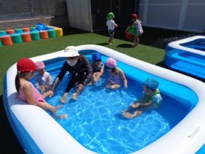 プール遊びをしました。お腹に少しずつお水をかけて慣らしながら、ゆっくりプールの中へ座ります✨