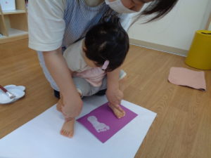 まずは絵の具で足型👣をとりました。何になるかはお楽しみ(⋈◍>◡<◍)。✧♡