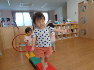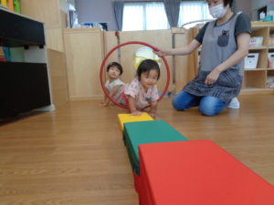 その後はフープや平均台マットを使い、くぐったり、バランスをとったりしながら体をしっかり動かして遊びました(●´ω`●)