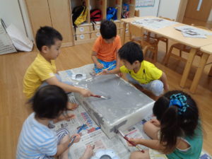 みんなで集まって、何やら大きい箱に色をぬっているようですね。