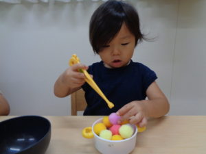 めろん組さんは室内遊びの後は、みんなで楽しくおはしの練習をしました(^▽^)