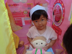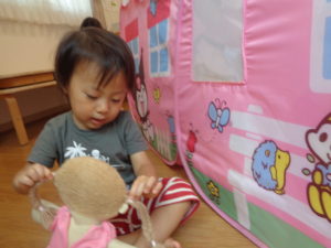 ひまわり組さんは、テントのお家でおままごとをして遊びました。