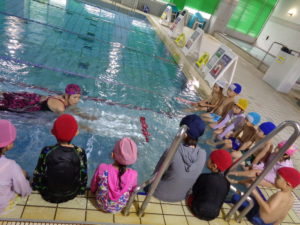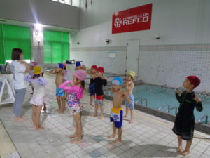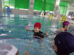 プールに入った後は、水の中でカニさん歩きやケンケンパをして体を動かしたり、潜って輪っかを拾ったりしましたよ🦀