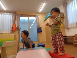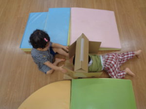段ボールのトンネルも上手にズリズリと体を動かしながら、ほふく前進で進むことができていますね!
