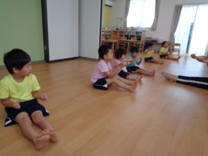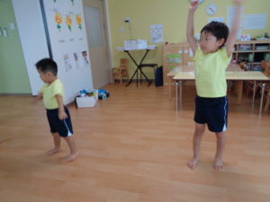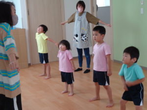 まずは準備体操のダンスから!!恥ずかしくて動けなかったお友だちも、今では楽しそうに先生の真似をして体を動かせるようになりました😆