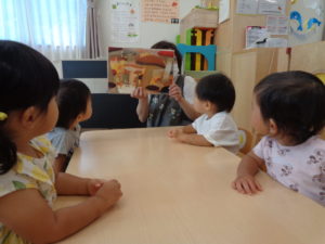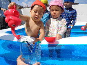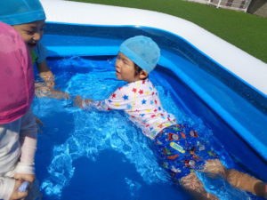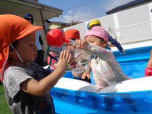 製作の後はプールをしました。じょうろに水を入れて自分にかけたり、お友だちがもっている容器に水を入れてあげたりと、お友だちとのかかわりがたくさん見られました😉