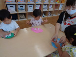 プールの後は製作をしました。足に絵の具を付けてペタペタ。可愛い足形がたくさん🥰なにができるのかな?