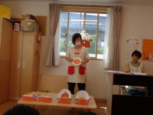『十五夜はお月さまを見ながら、秋に美味しい野菜や果物、お米がとれたことをお祝いするんだよ』とお話しをして、紙皿シアターの始まりです🎶「で~た~で~た~つ~き~が~」とお月見の歌を歌うといろんなものが出てきましたよ°˖✧◝(⁰▿⁰)◜✧˖°めろん組やそら組のお友だちは紙皿が何か分かると「くり~」「かき~」と答えを教えてくれました✨小さいお友だちも上手に座って参加できました(⋈◍>◡<◍)。✧♡