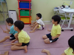 リトミックでは音楽に合わせてバチを使ってリズムたたきをしました。