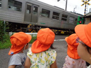 みんなで歩いて神社の周りをぐるり~ちょうどタイミングよく電車を見ることができて大喜びでしたよ❤