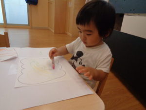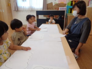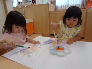 まずは製作をしました。先生のお話を聞いてから、クレヨンや絵の具で色をつけました😊