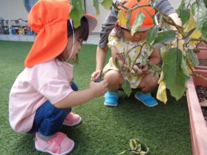 製作の後は園庭で遊びました!おや?なすが実っているのを発見!まん丸だね!