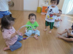 めろんぐみさんも、リトミックの後はひまわりぐみさんと園庭で仲良く遊びました。