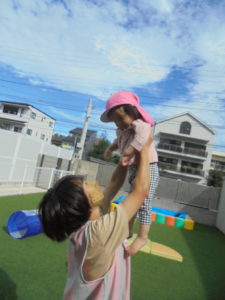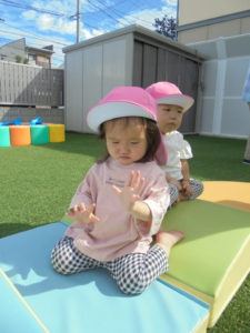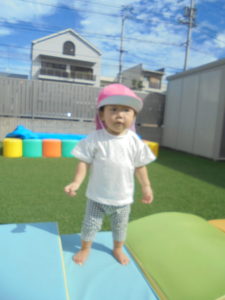 人工芝の感触にも慣れてきて、自分からどんどんはいはいをしているいちご組さん。