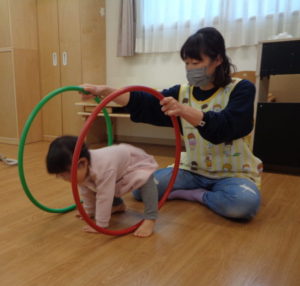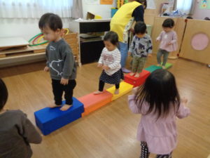 前回りや鉄棒、一本橋やフープくぐりをしました。