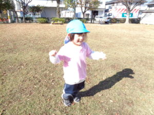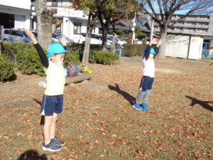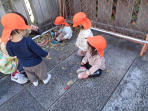 落ち葉にどんぐり、木の枝など、発見したものを伝え合い、遊びに取り入れる姿も見られました(^^)/