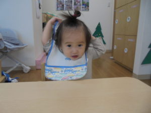 おやつのエプロンをつける練習をしていますね。できたかな?