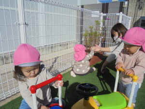 園庭では車のおもちゃやしゃぼん玉など、体を動かして遊びました!