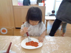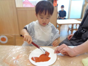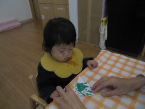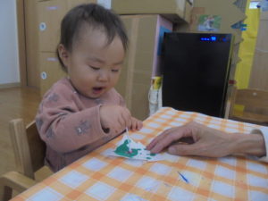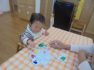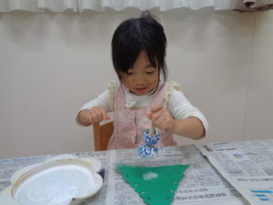 いちご組さんは、リース飾りのツリーを製作しました。手型スタンプの上から綿棒スタンプで「トントン」カラフルツリーの出来上がり。