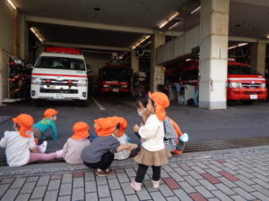 救急車や消防車を見に行きました。救急車を見つけると「きゅうきゅうしゃーみてみて」と大きな声で知らせてくれたね。