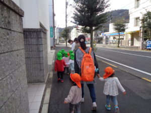 帰り道でめろん組さんとバッタリ、手をつないで一緒帰ってくれました。お兄さんお姉さんに手つないでもらってみんなとても嬉しそうでしたね。