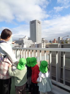 その後は、園周辺を散歩に出かけました。そら組さんと上った県庁を、歩道橋から眺めました。