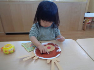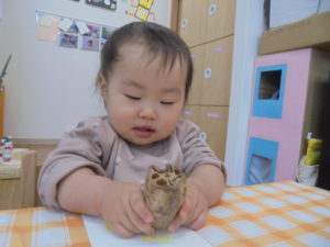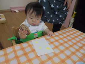 いちご組さんは、レンコンを使って絵の具スタンプをしましたよ(⌒∇⌒)