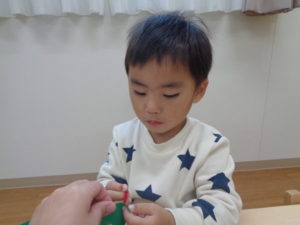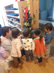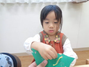 クリスマスツリーをよく観察した後で、ツリーにひもを通していますよ(o^―^o)